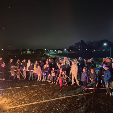 Op de parkeerplaats brandde het grote Sint-Maarten vuur, volledig opgebouwd en aangestoken door leden van Scouting St. Tarcisius. Onze vrijwilligers zorgden voor de opbouw, veiligheid en afzetting, zodat iedereen veilig en met volle aandacht kon genieten.